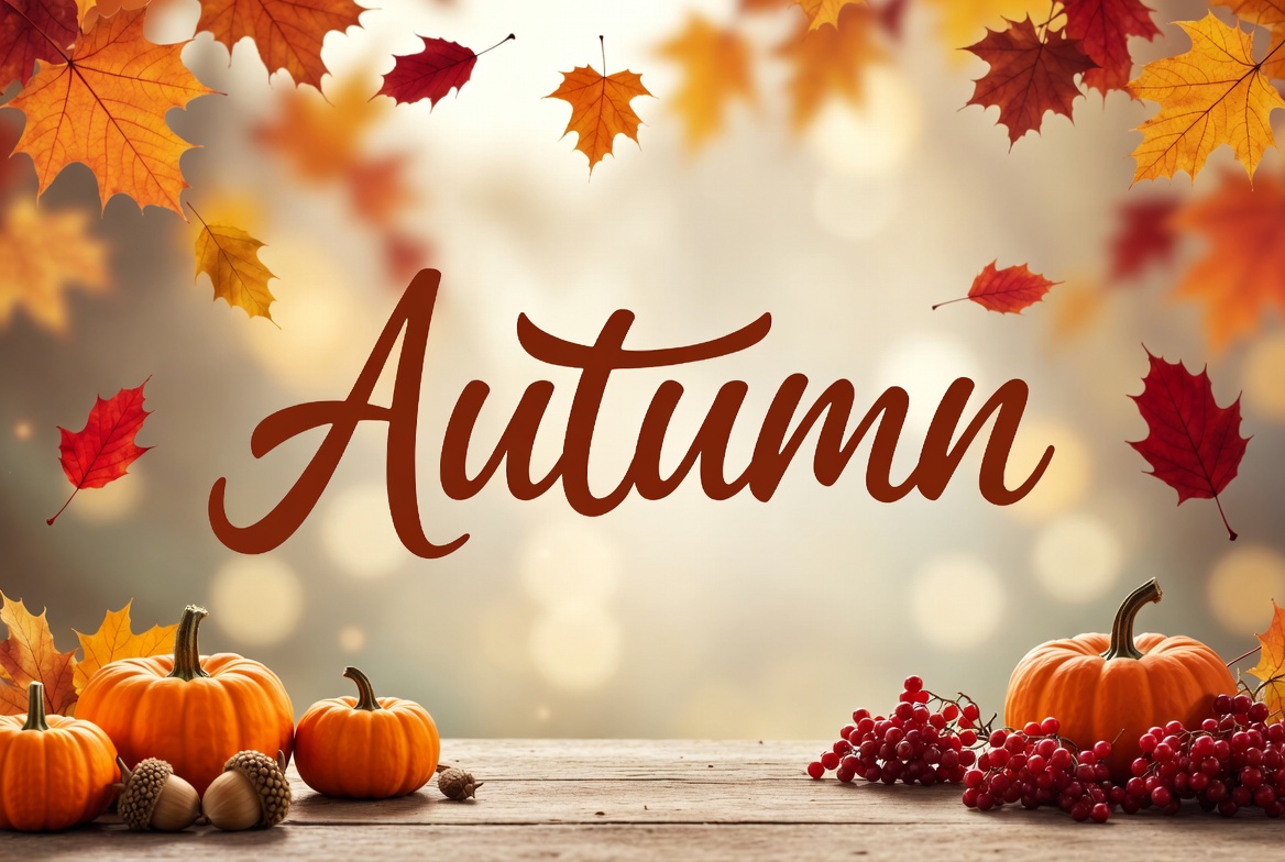 A wooden surface displays small orange pumpkins, acorns, and clusters of red grapes. Vibrant fall leaves float around the elegant cursive word 'Autumn' in the center. The background features a soft bokeh glow with scattered leaves.