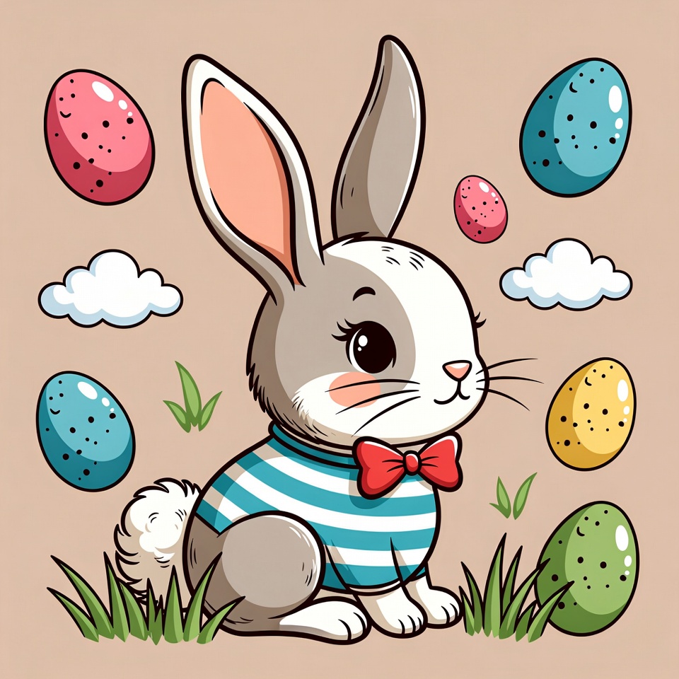 A cute cartoon bunny with gray and white fur sits on grass wearing a striped shirt and red bow tie. Colorful Easter eggs in pink, blue, green, and yellow float around it against a beige background with clouds and grass. The bunny has large expressive eyes and long ears.