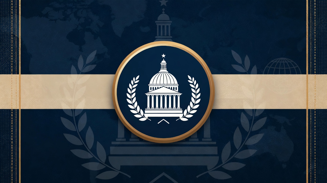 A white silhouette of the US Capitol dome is centered within a circular gold-edged frame on a dark navy background. Flanking laurel wreaths surround the Capitol, with subtle globe and world map elements in the backdrop. Gold and beige ribbon borders frame the elegant emblem design.