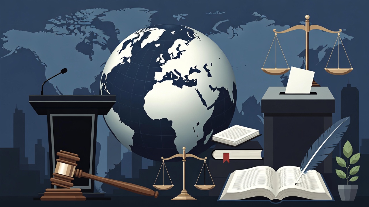 A vector illustration features golden scales of justice, a large Earth globe, and a ballot box on a dark blue background with city skyline silhouettes. A podium with microphone stands beside stacked books, an open book, and a quill feather. Symbolic elements of law, democracy, and global governance are depicted in flat design style.