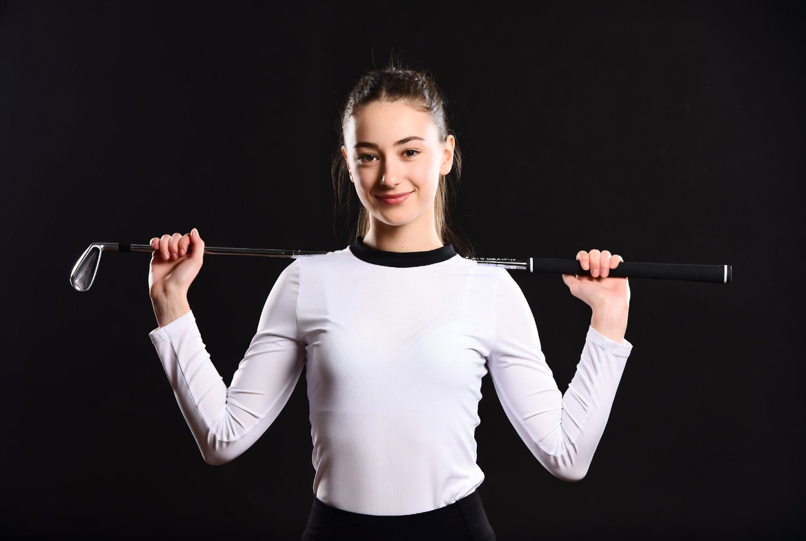 White, black collar, black pants, dark hair, female, golf club, golf equipment, golfer, holding golf club, isolated background, long sleeves, ponytail, smiling, sports, studio portrait, white top, young woman, woman