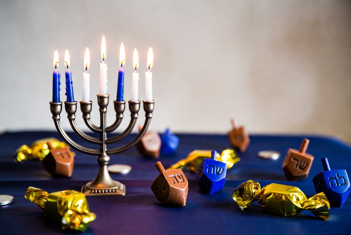 A golden Hanukkah menorah with lit blue candles stands on a dark blue surface. Surrounding it are colorful dreidels in blue, brown, and gold, along with gold foil chocolate coins and candies. The scene is captured against a light blurred background.