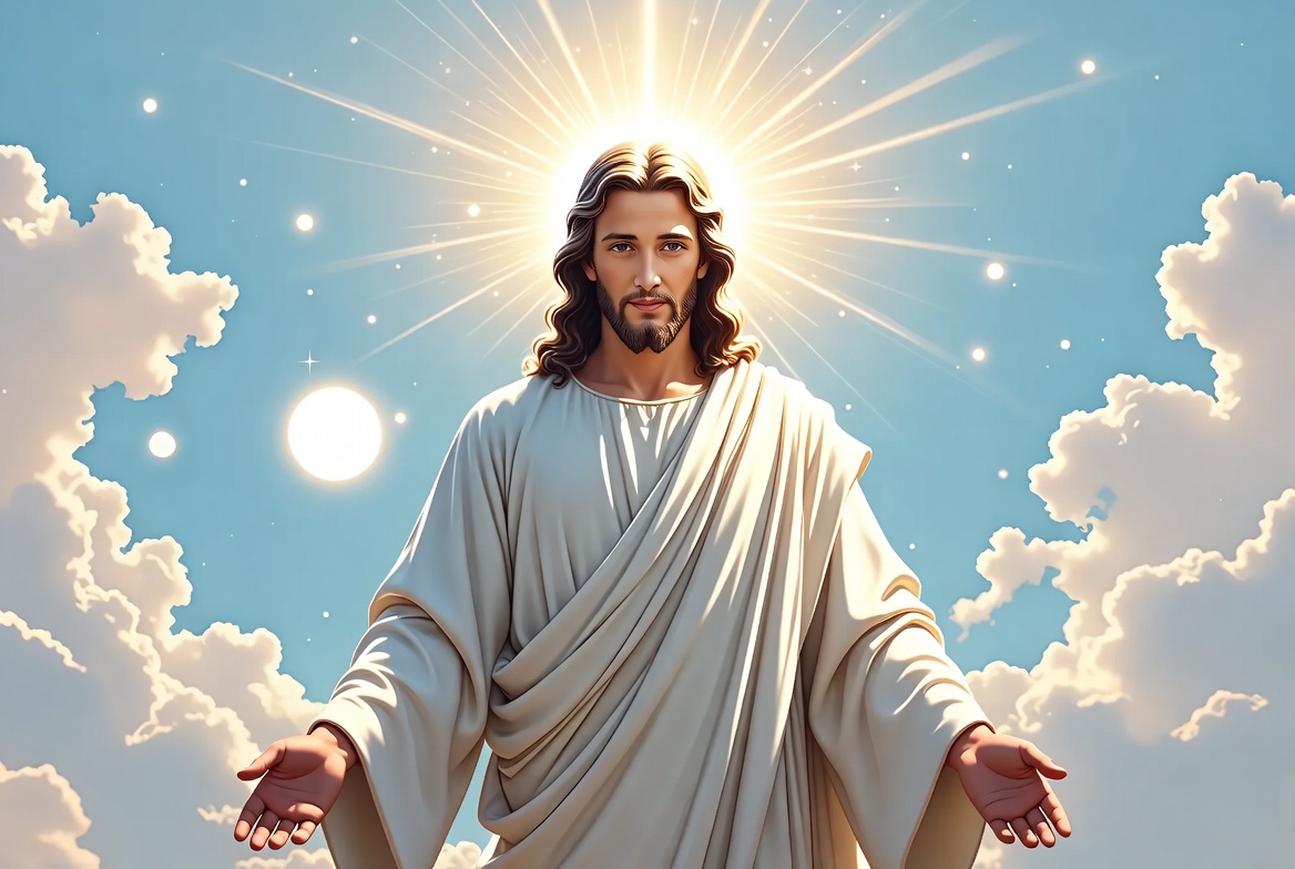 An illustration of Jesus Christ with long blonde hair and beard, wearing a white robe, stands with arms outstretched. A radiant halo and beams of light shine behind his head amid fluffy white clouds and stars in a blue sky. His expression is serene and divine.