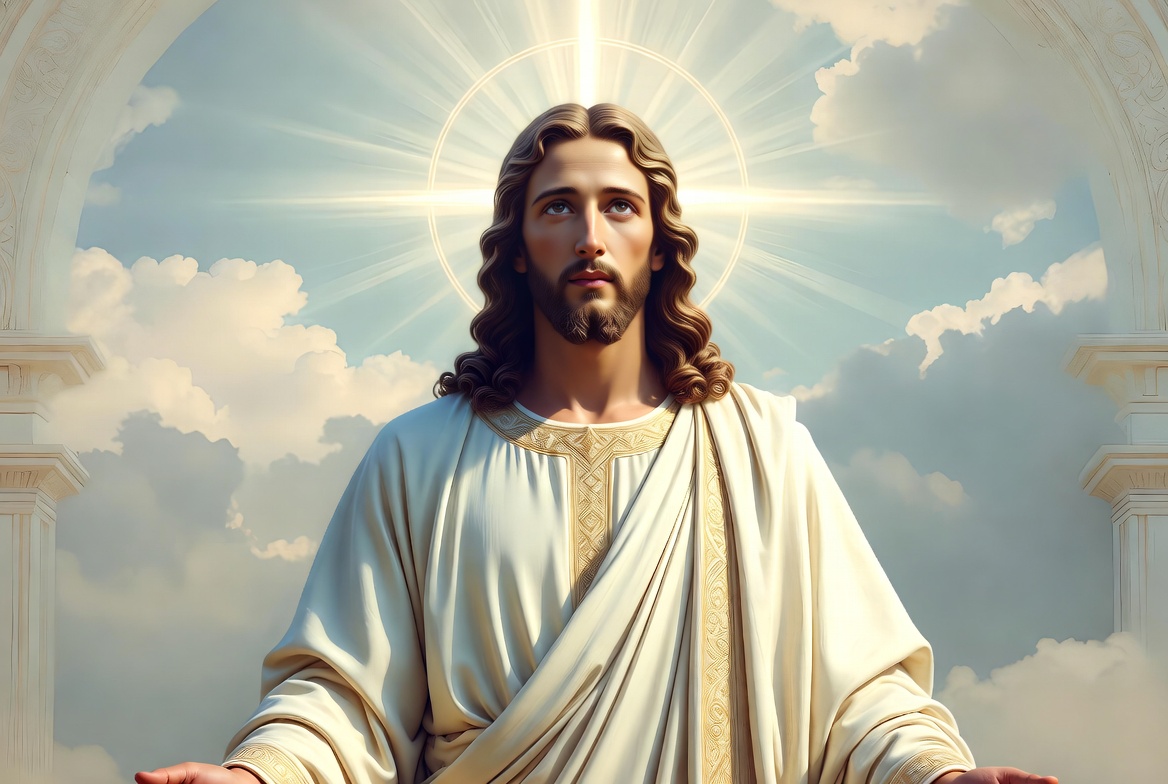 A digital illustration of Jesus Christ standing in a heavenly archway with clouds and radiant light. He has long brown hair, a beard, and wears a white robe with gold trim, arms outstretched. A bright glowing halo shines behind his head against a blue sky.