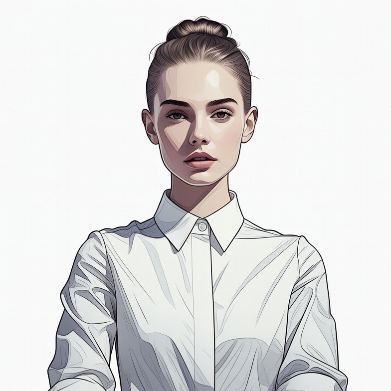 Digital illustration of a young woman with light brown hair styled in a neat bun. She wears a crisp white collared shirt with rolled sleeves and gazes forward with a subtle expression. The figure is centered on a plain white background.