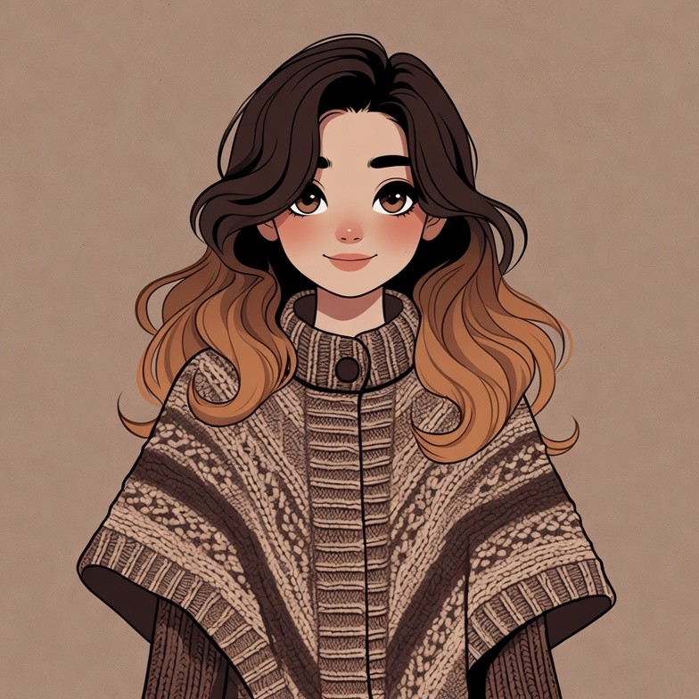 anime style, beige background, brown hair, button poncho, cute girl, detailed drawing, digital art, female, illustration, isolated background, knitted poncho, orange highlights, poncho, portrait, smiling, sweater poncho, wavy hair, woman