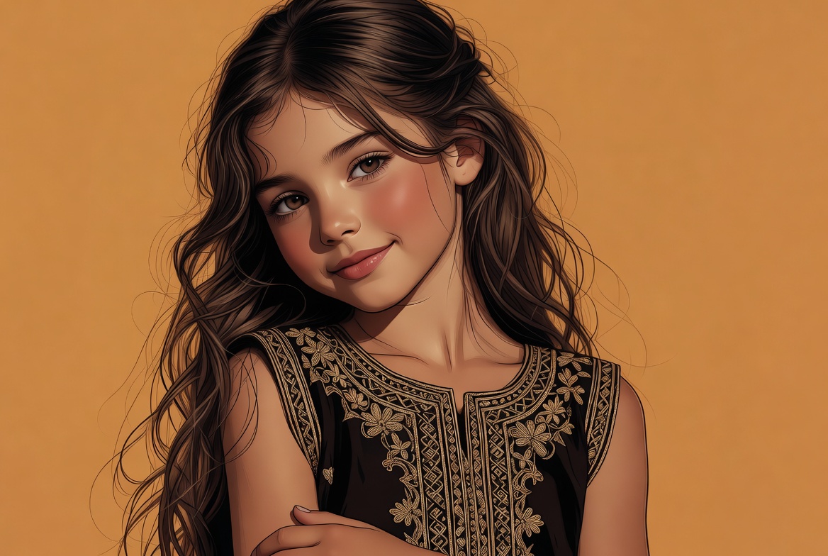 A young girl with long wavy brown hair smiles gently at the viewer against an orange background. She wears a sleeveless black top with intricate gold embroidery and has her arms crossed. Her makeup includes rosy cheeks and defined eyes.