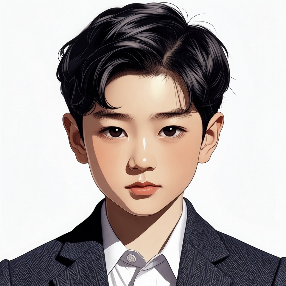 A young Asian boy with short black hair and expressive eyes faces forward in a detailed digital illustration. He wears a dark textured suit jacket over a white collared shirt. The portrait is set against a plain white background with soft lighting on his face.