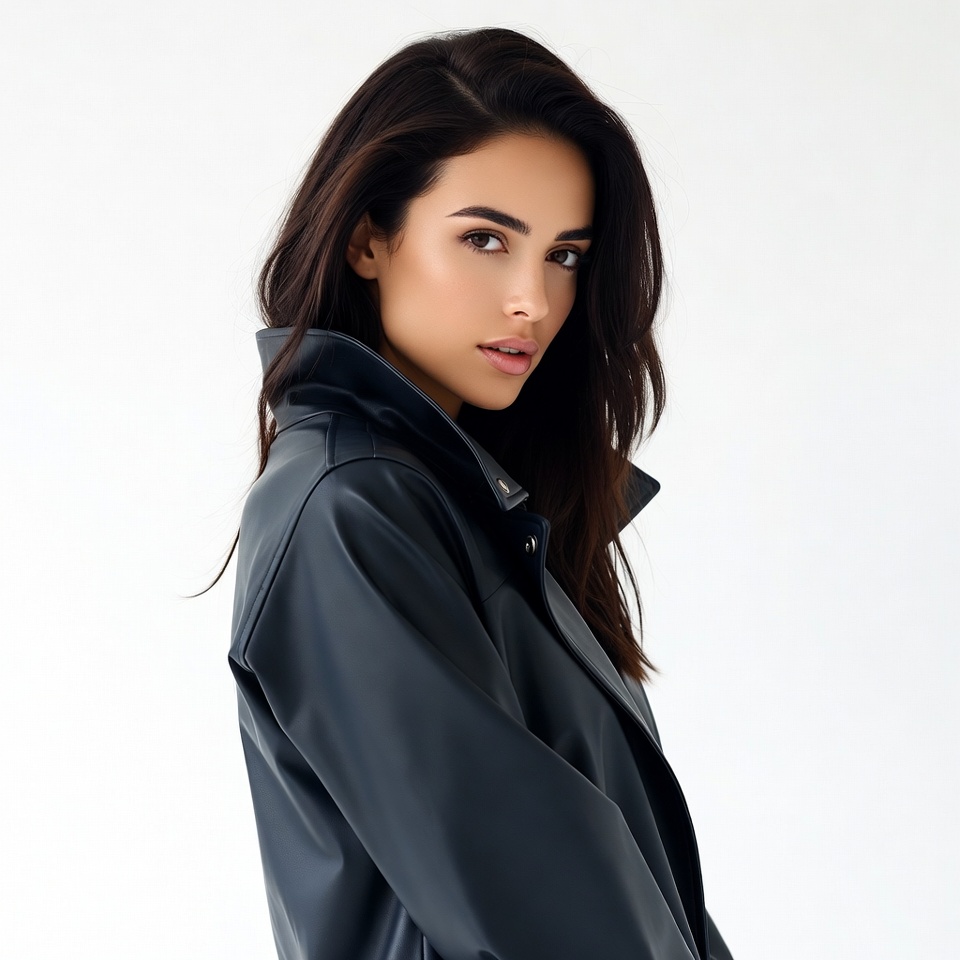 A woman with long dark wavy hair stands sideways against a white background, wearing a shiny black leather jacket. She has a subtle makeup look with defined eyes and lips, gazing slightly to the side. The jacket features a collared design and is cropped at the waist.