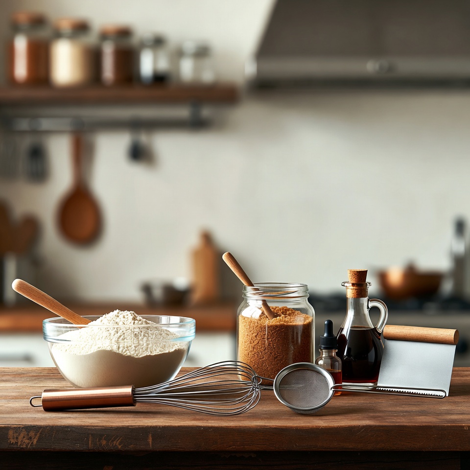 baking setup, cooking tools, flour, flour bowl, glass jars, home kitchen, kitchen table, kitchen utensils, metal scoop, oil, oil bottle, pantry shelves, recipe ingredients, rolling pin, rustic kitchen, spices, sugar, sugar jar, whisk, wooden spoons, wooden table, baking ingredients