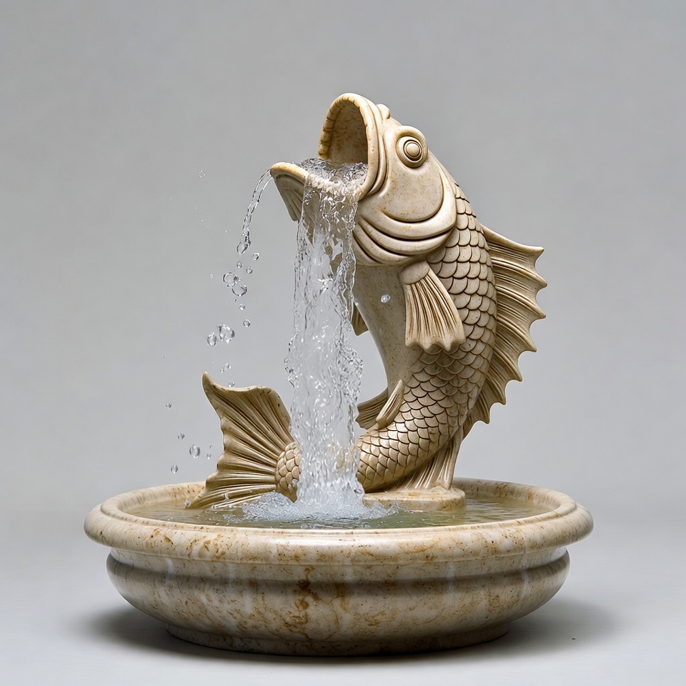 aquatic statue, beige stone, carved sculpture, decorative fountain, fish art, fish sculpture, fish statue, flowing water, fountain basin, fountain sculpture, garden fountain, isolated background, jumping fish, ornate fish, sculpture fountain, stone basin, stone fish, water fountain, water spout, fish fountain