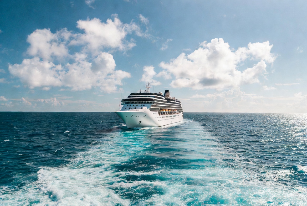 blue sky, blue water, clouds, cruise liner, horizon, luxury liner, maritime, nautical, ocean, passenger ship, sailing, sea, travel, vacation, vessel, wake trail, waves, white ship, cruise ship