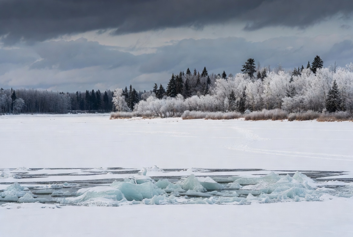 cloudy sky, cold weather, evergreen trees, fir trees, frost covered, frozen water, gray clouds, hoarfrost, ice, ice chunks, icy water, lake shore, landscape photography, nature, outdoor, pine trees, reeds, snow, snowy forest, wilderness, winter landscape, winter scene, frozen lake