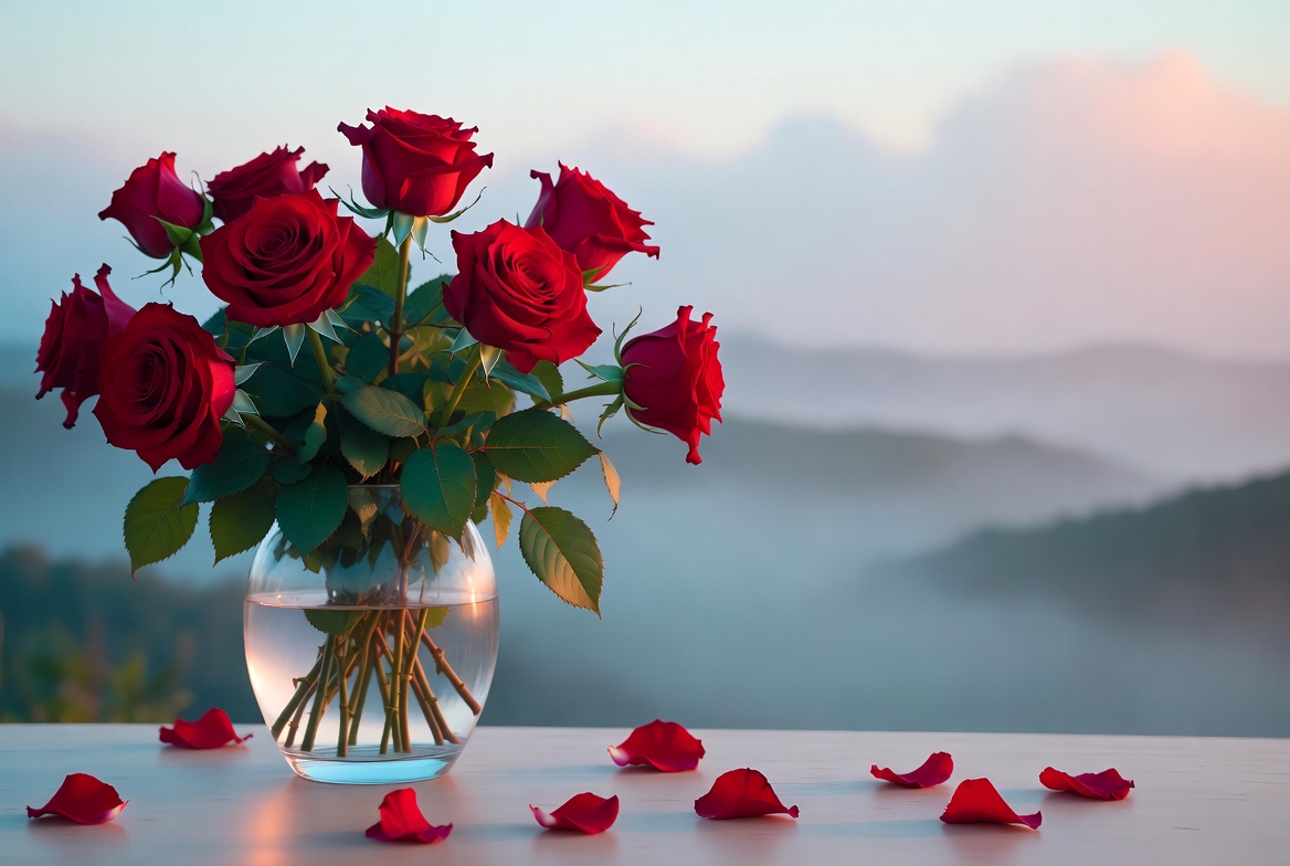 A bouquet of vibrant red roses stands in a clear glass vase on a table with scattered rose petals. Lush green leaves accent the stems, visible through the transparent vase. Misty mountains glow in sunset hues under a cloudy sky in the background.