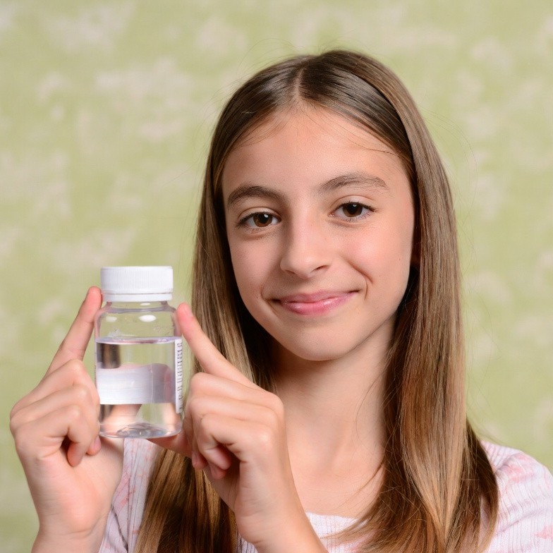 A young girl with long brown hair smiles while holding up a small clear plastic bottle containing a clear liquid. She stands against a green background and uses both hands to display the bottle with white cap. Her expression is cheerful and engaging.