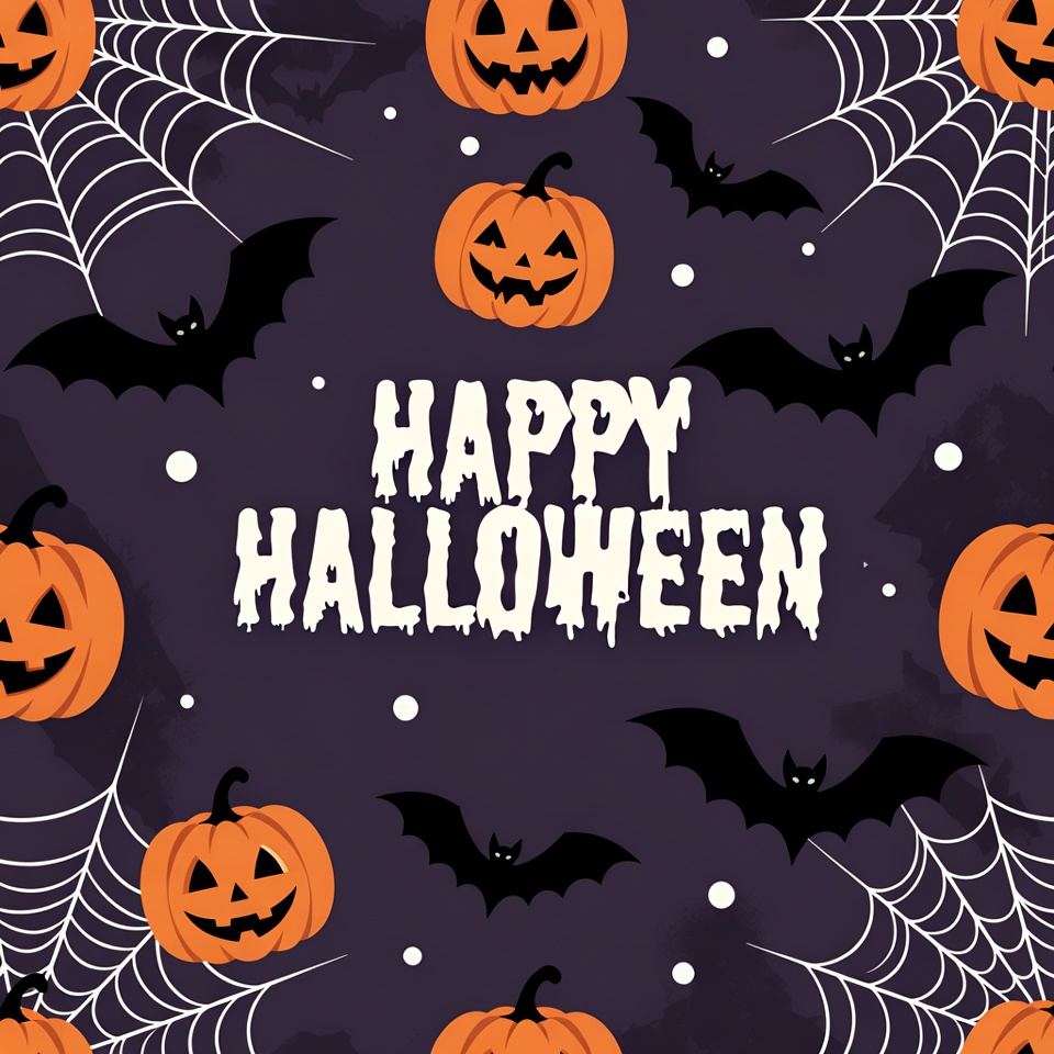 A vibrant Halloween illustration features carved orange jack-o'-lantern pumpkins, black bats, and white spider webs on a purple background. The text 'Happy Halloween' appears in large, dripping white letters at the center. Scattered white dots add texture to the festive design.