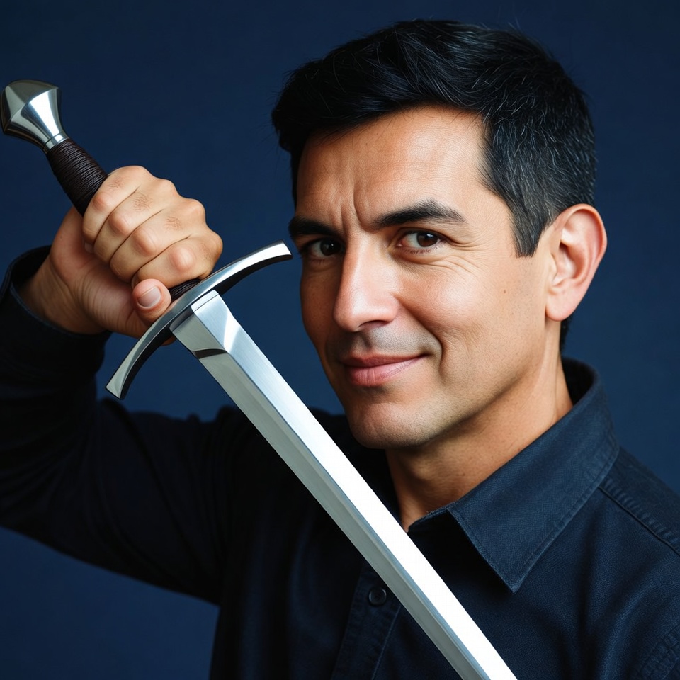 A man with short dark hair and a slight smile grips a large silver sword with both hands in front of him. He wears a dark collared shirt and stands against a solid blue background. The sword features a wrapped leather hilt and pointed crossguard.