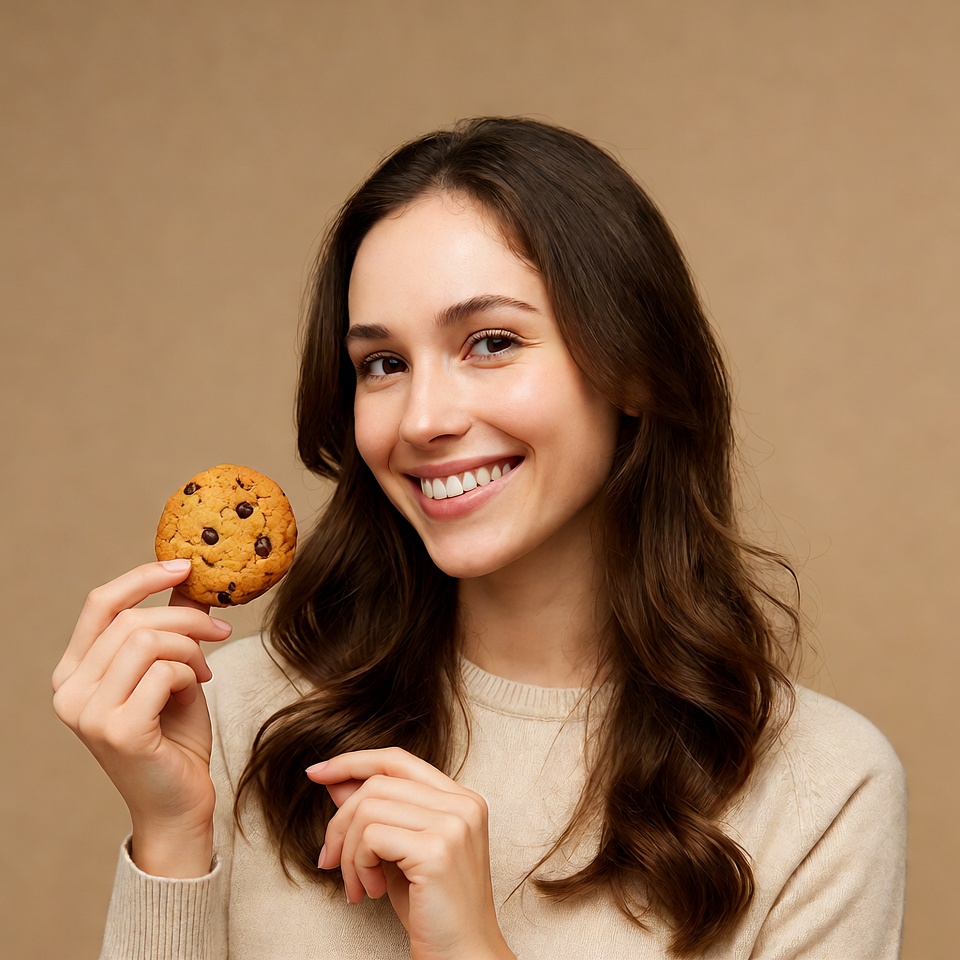 A young woman with long brown hair smiles while holding a large chocolate chip cookie in her hand. She wears a light beige sweater and stands against a neutral beige background. Her expression is joyful with bright eyes and a wide smile.