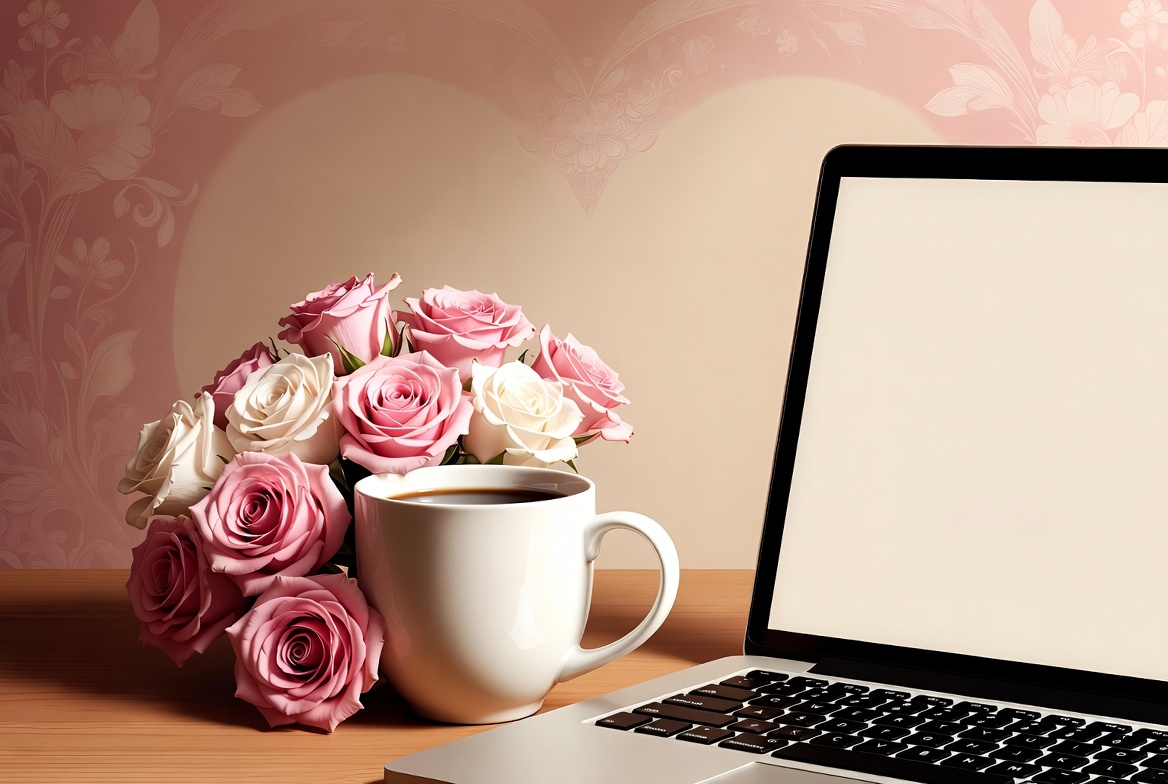 A bouquet of pink and white roses sits on a wooden table next to an open silver laptop with a blank screen. A white ceramic cup filled with coffee is positioned beside the laptop. The background features a soft pink wallpaper with heart patterns.