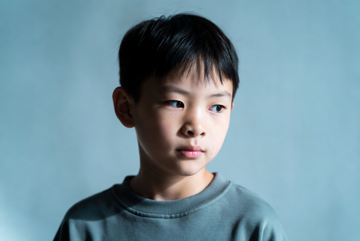 A young Asian boy with short black hair and almond-shaped eyes faces slightly to the side against a light blue background. He wears a gray crewneck sweatshirt and has a neutral expression. His skin is smooth and fair.
