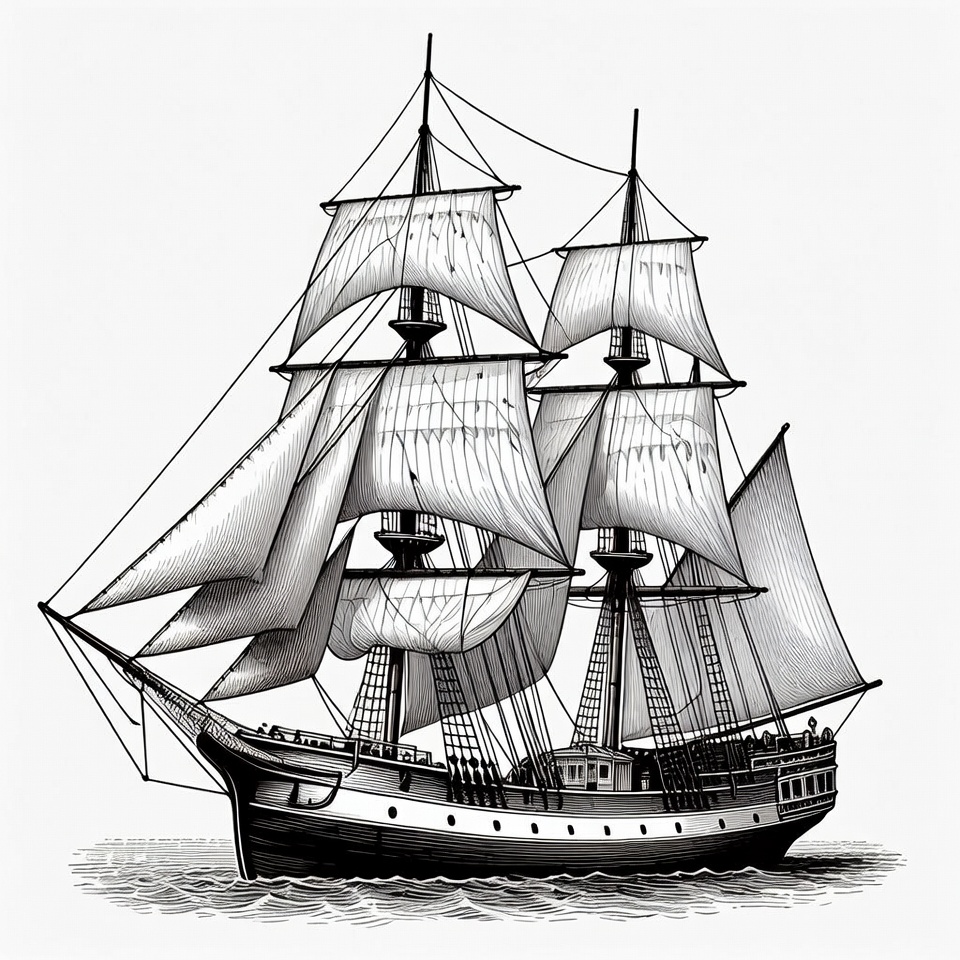 A detailed black and white ink illustration of a classic three-masted sailing ship with full sails billowing in the wind. The ship features intricate rigging, wooden hull, and multiple decks, floating on calm ocean waters. It is depicted in a vintage engraving style with fine line work.