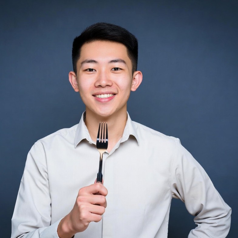A young Asian man with short black hair smiles while holding up a black fork in his right hand. He wears a white collared shirt and stands against a solid blue background. His expression is cheerful with narrowed eyes and a wide smile.