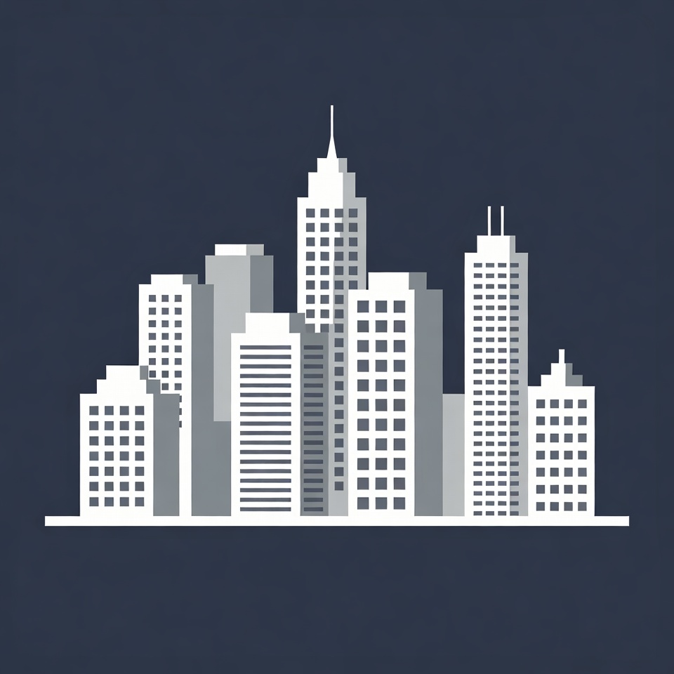 A minimalist white silhouette of a city skyline features multiple tall skyscrapers and buildings. The structures vary in height with flat roofs and simple geometric shapes. The illustration is set against a solid dark blue background with a subtle base line.