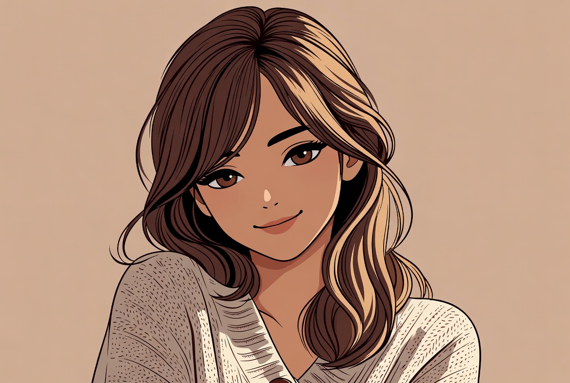 A detailed anime-style illustration of a young woman with long wavy brown hair and large expressive eyes. She has a gentle smile and fair skin, wearing a light-colored knit sweater with a V-neck. The portrait is set against a plain beige background.