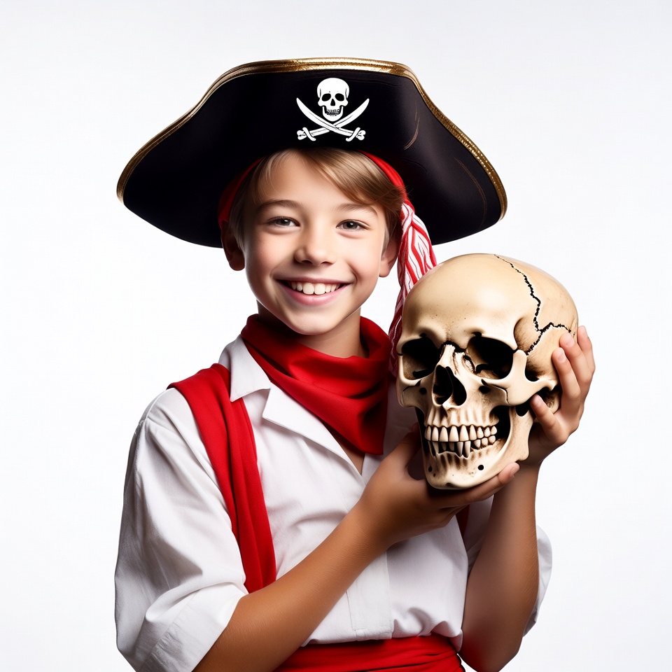Halloween costume, boy pirate, child, costume prop, crossbones, happy child, isolated background, kids costume, pirate costume, pirate hat, plastic skull, red bandana, red vest, skull, smiling boy, tricorn hat, white shirt, young pirate, boy