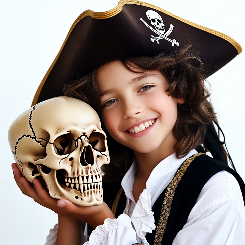 A young girl with curly brown hair wears a pirate costume featuring a wide-brimmed hat with skull and crossbones, a white ruffled shirt, and black vest. She smiles happily while holding a realistic human skull in her hands against an isolated white background. Her green eyes and joyful expression are prominent.