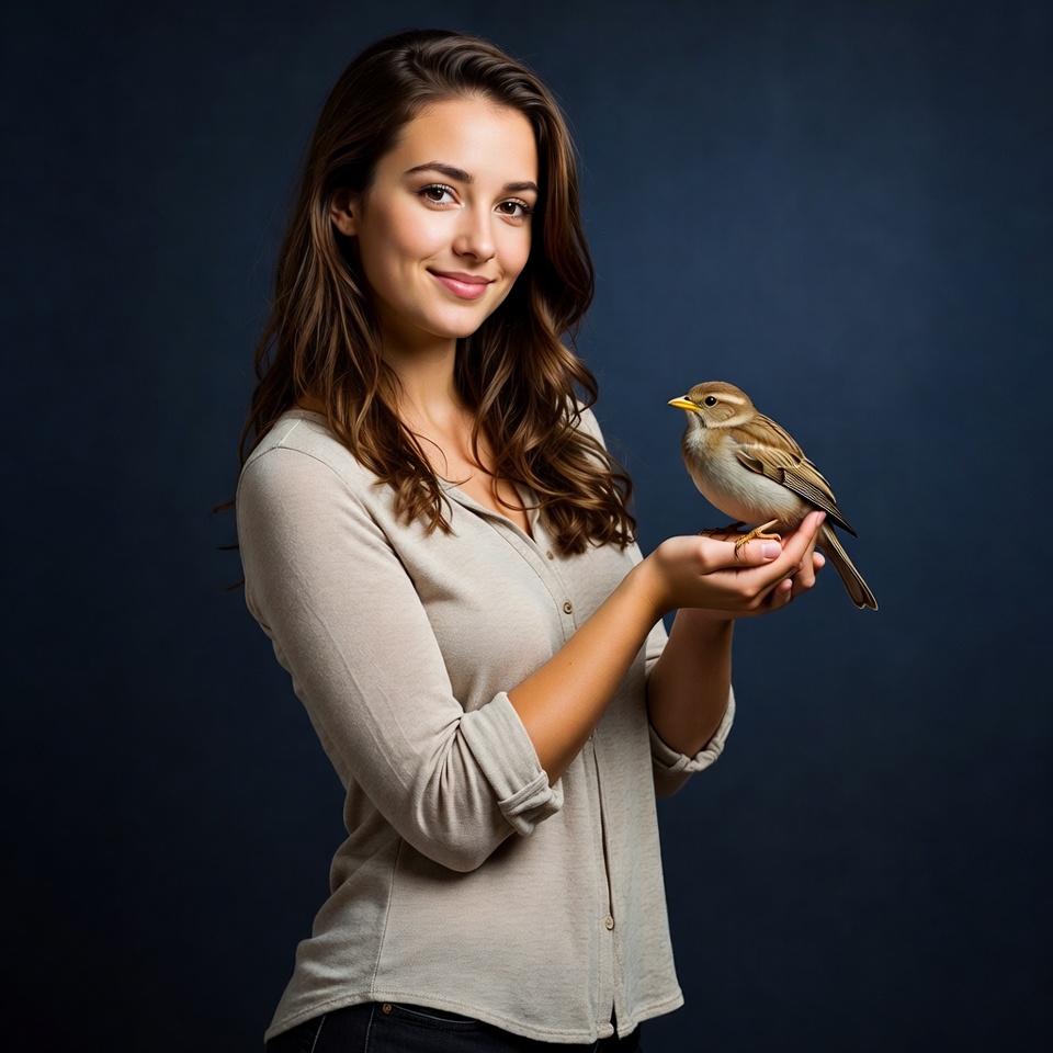 A young woman with long brown wavy hair smiles while gently holding a small brown sparrow in her hands. She wears a light gray button-up shirt with rolled sleeves and dark pants, standing against a dark blue background. The bird perches calmly on her palms with its wings slightly spread.