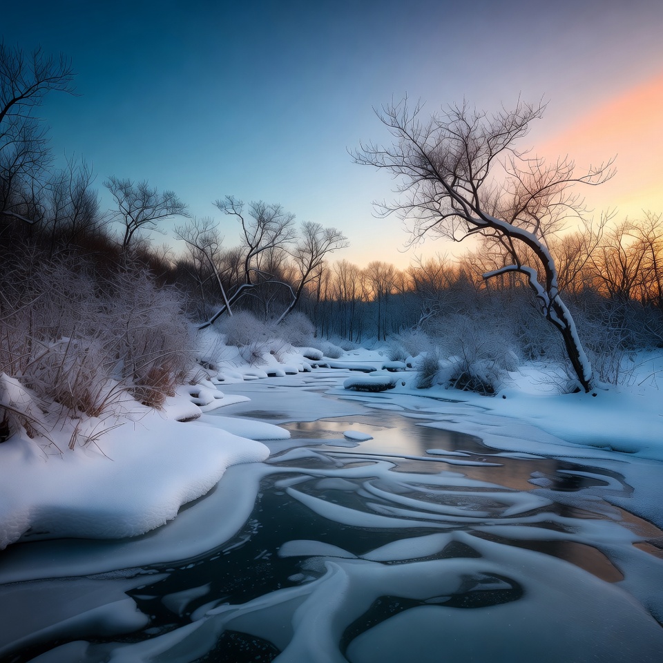 A winding frozen river covered in intricate ice patterns flows through a snowy forest at sunset. Bare trees with snow-laden branches line the banks under a gradient sky of blue and orange hues. The scene captures the serene winter landscape with thick snow on the ground and bushes.