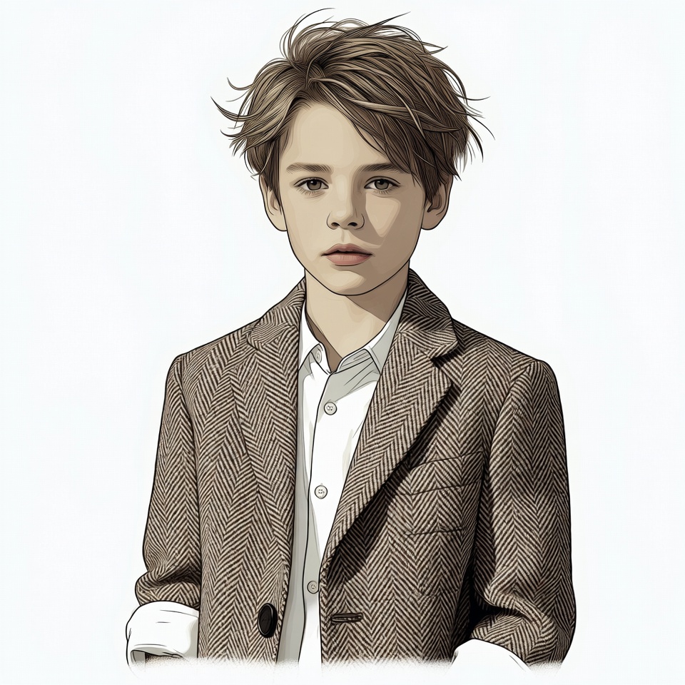 An illustration of a young boy with tousled light brown hair stands frontally. He wears a brown herringbone blazer over a white collared shirt with cuffed sleeves. The image features a clean white background.