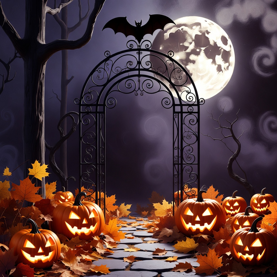 A wrought iron gate stands in a dark forest path lined with glowing jack-o'-lantern pumpkins and scattered autumn leaves. A large full moon shines behind the gate, with bats flying nearby and spooky trees framing the scene. The bokeh-lit background enhances the eerie Halloween atmosphere.