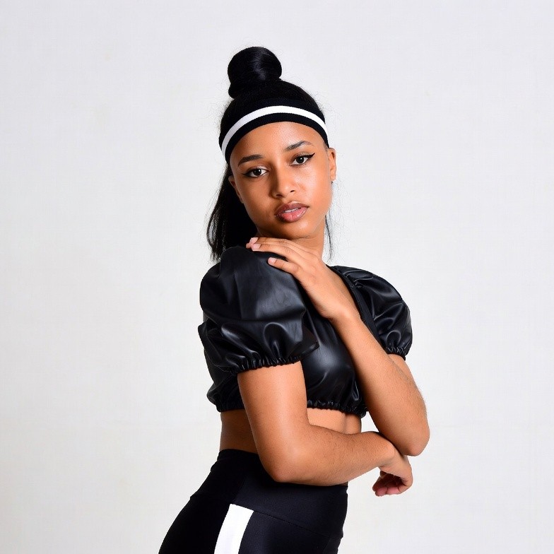 African-American, Black, black outfit, bun hairstyle, fashion, female, hand on shoulder, headband, leather crop top, leggings, long hair, posing, puffed sleeves, shiny leather, striped leggings, studio photo, stylish pose, white background, white headband, young woman, woman