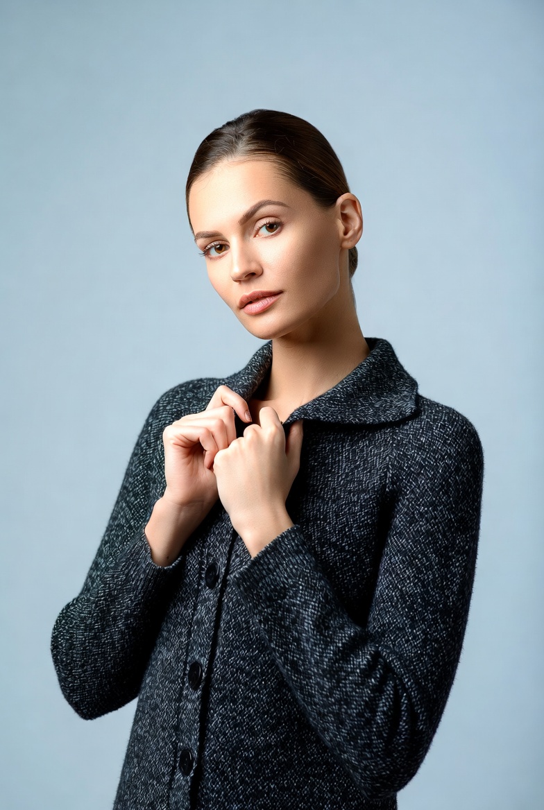 A woman with brunette hair in a sleek ponytail stands against a light blue background. She wears a textured black knit cardigan with buttons and a collared neckline. Her hands gently grasp the collar as she gazes slightly to the side.