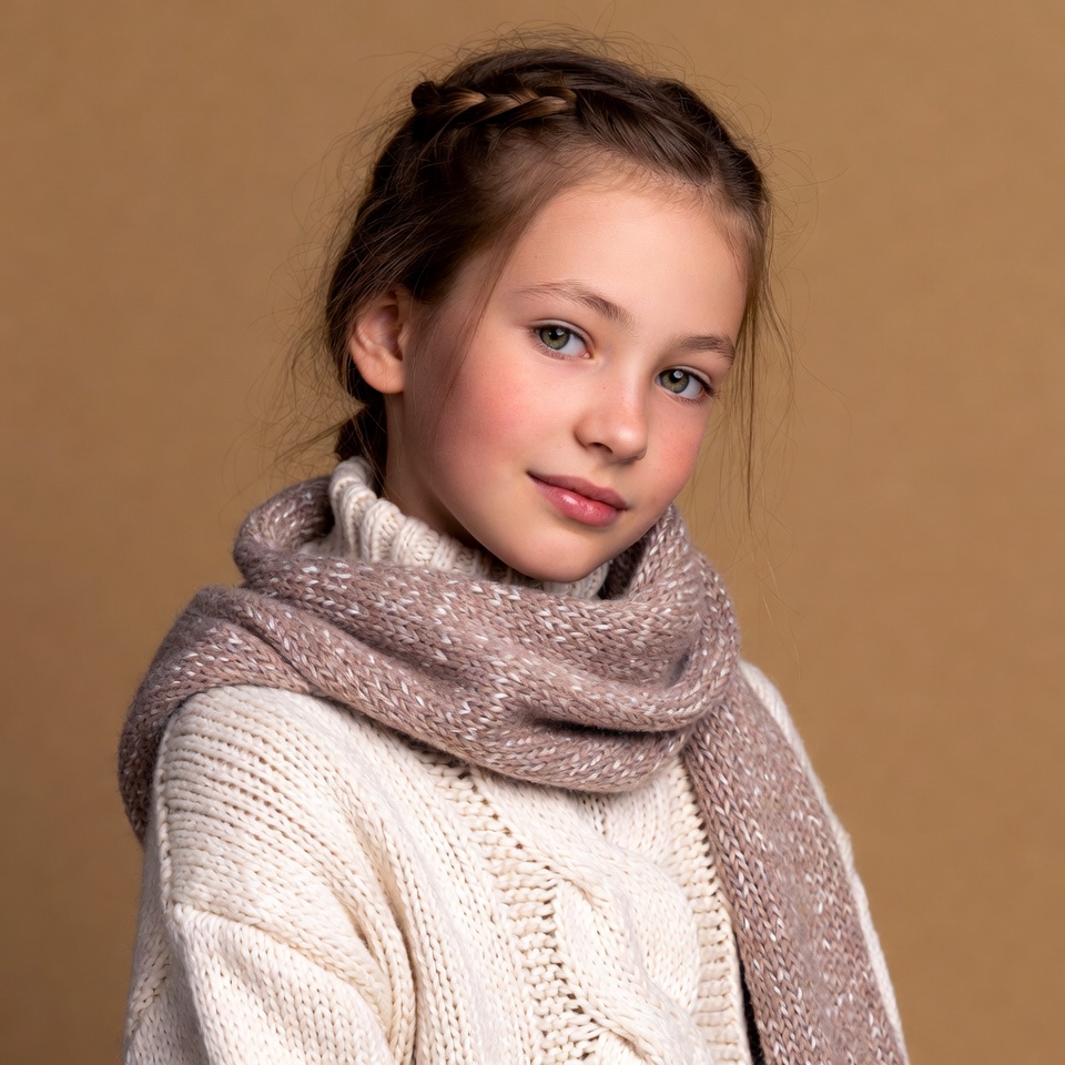 A young girl with light brown hair in braids looks directly at the camera. She wears a white cable-knit sweater and a light brown scarf draped around her neck. She stands against a plain beige background.