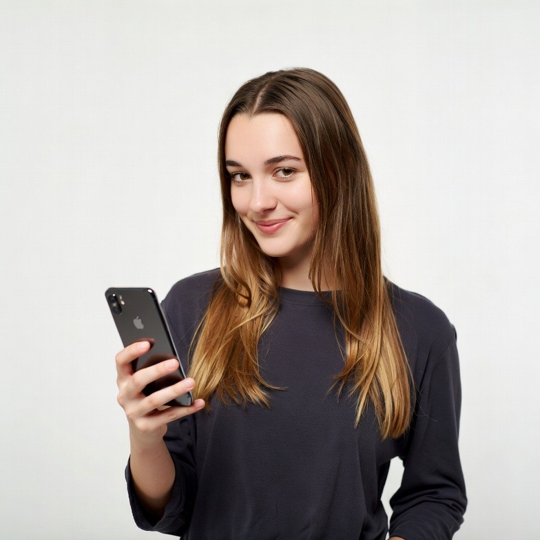 A young woman with long brown hair smiles while holding a black iPhone in her hands. She wears a dark blue long-sleeved top and stands against a plain white background. Her expression is happy and relaxed as she looks at the phone.