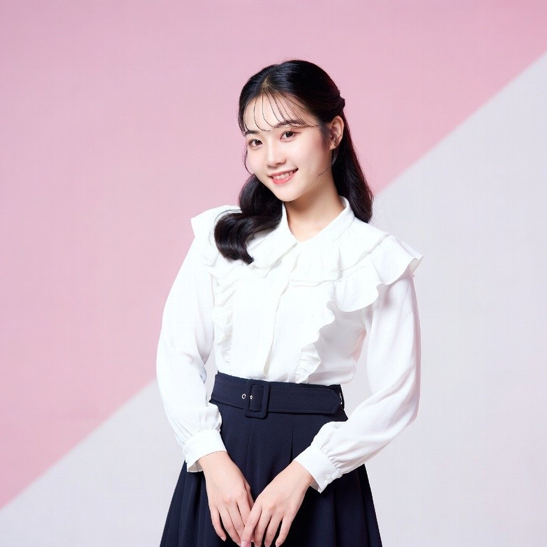 A young Asian woman with long dark hair tied back smiles at the camera. She wears a white long-sleeve blouse with ruffled collar and cuffs paired with a black skirt. She stands against a pink and white gradient background with hands clasped in front.
