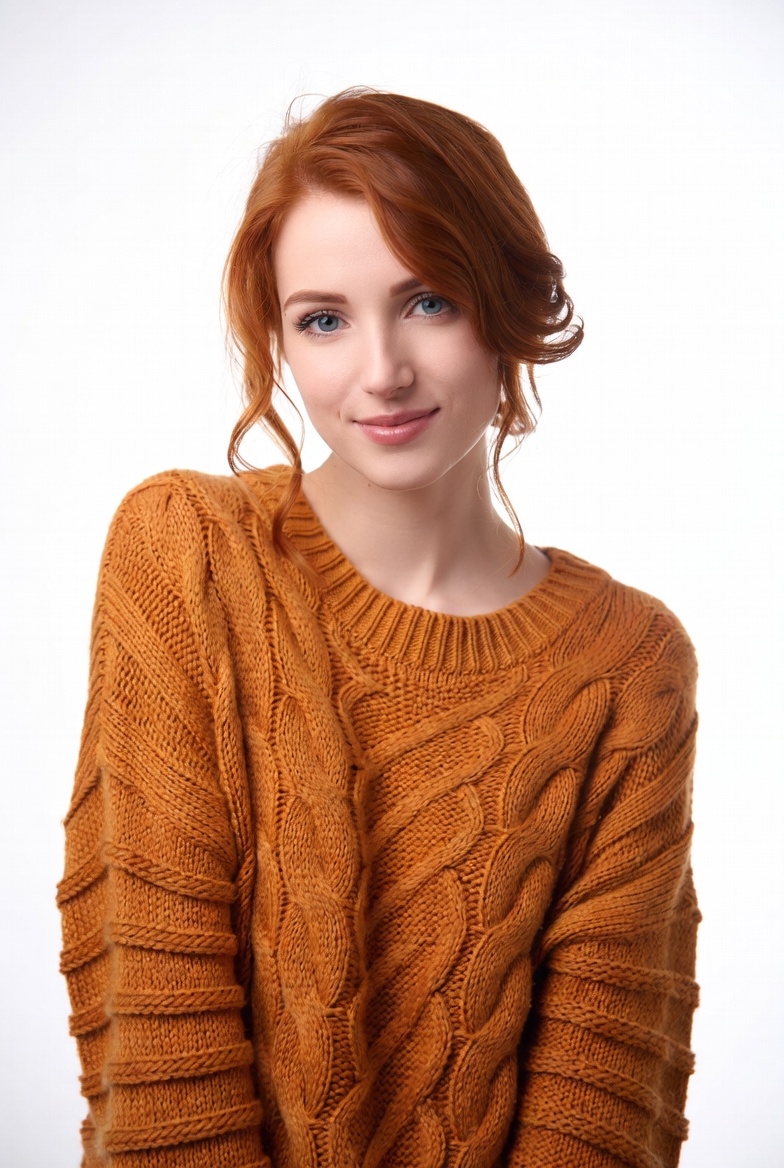 White, beautiful woman, blue eyes, chunky knit, crew neck, fair skin, female, ginger hair, headshot, knit sweater, orange sweater, portrait, red hair, redhead, smiling, soft smile, updo hairstyle, white background, young woman, woman