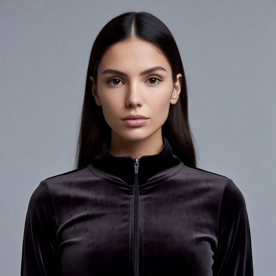 Middle Eastern, beauty, black hair, black jacket, close-up, dark eyes, fashion, female, gray background, headshot, long hair, neutral expression, portrait, straight hair, stylish, velvet jacket, young woman, zip jacket, woman