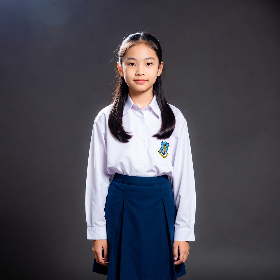 A young Asian girl with long black hair stands smiling in a white collared shirt and navy blue pleated skirt. She wears a school badge on her uniform and poses against a dark gray background. Her hands are clasped in front of her.