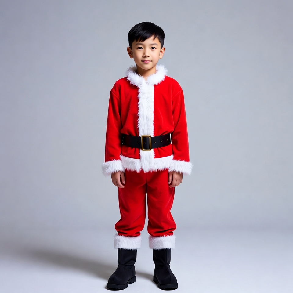 A young Asian boy with short black hair stands smiling in a full red Santa Claus costume. The plush outfit features white faux fur trim on the jacket, pants, and boots, along with a wide black belt and buckle. He poses frontally against a plain gray background.