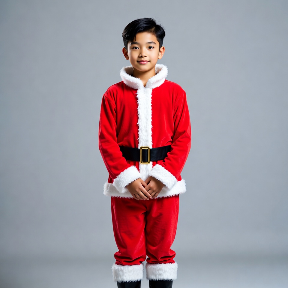 Asian boy, Asian child, Christmas outfit, Santa boots, Santa costume, Santa pants, black belt, child actor, cute boy, festive boy, gray background, holiday costume, male child, portrait, red Santa suit, short black hair, smiling boy, standing pose, white fur trim, young boy, boy