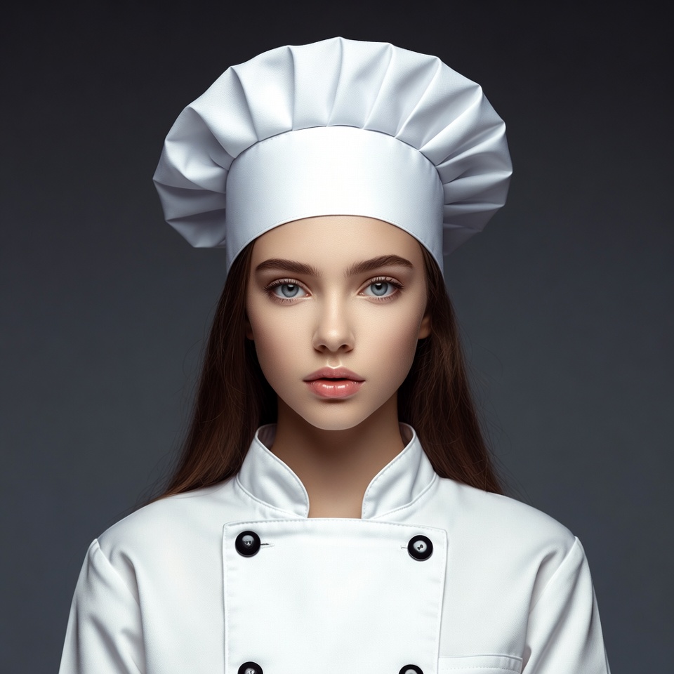 White, blue eyes, chef, chef jacket, cooking attire, fair skin, female chef, headshot, isolated background, long brown hair, portrait, professional chef, studio photo, toque, white chef hat, white uniform, young woman, woman