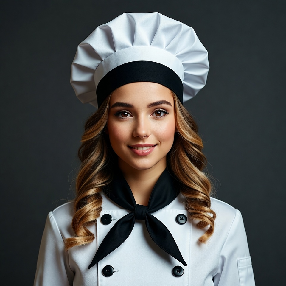 White, black necktie, blonde hair, chef, chef hat, chef uniform, cooking, dark background, female, headshot, kitchen uniform, portrait, professional chef, smiling, wavy hair, white jacket, young woman, woman