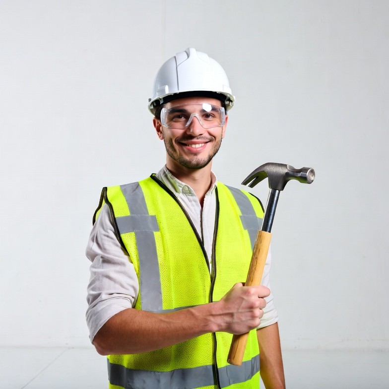 White, claw hammer, construction helmet, construction worker, goggles, hammer, hard hat, hi-vis vest, holding tool, male, posing, safety gear, safety goggles, safety vest, smiling, white background, wooden handle, worker, yellow vest, man
