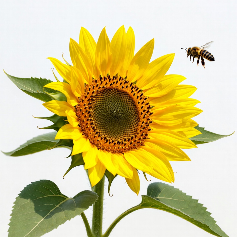 A vibrant yellow sunflower with large petals and green leaves stands against a white background. A bee with yellow and black stripes flies nearby, approaching the flower. The sunflower's brown center is detailed with small seeds.