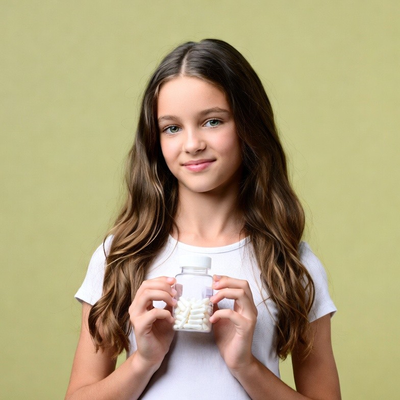 White, brown hair, female, green background, green eyes, holding bottle, isolated background, medication, pill bottle, smiling, supplements, vitamins, white pills, white t-shirt, young girl, girl