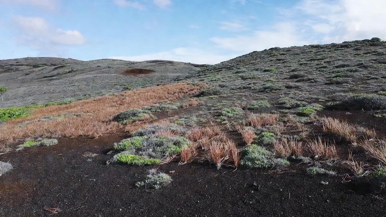 A rugged volcanic hillside features black lava rock covered in patches of sparse green and brown vegetation. Rolling hills extend into the distance under a clear blue sky with scattered clouds. The terrain shows earthy tones of dark soil and dry grasses.
